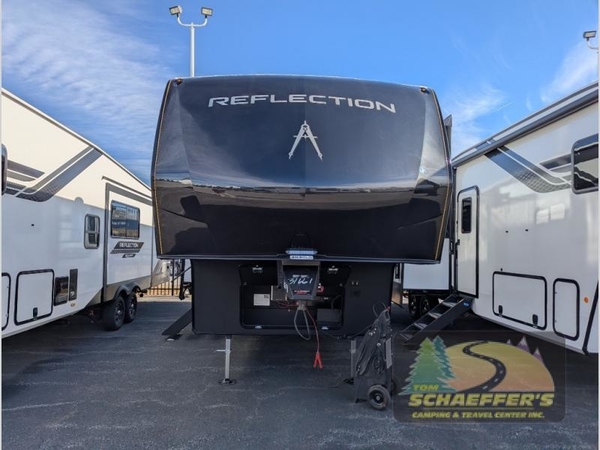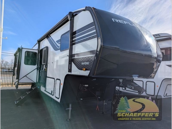 With any Reflection fifth wheel by Grand Design, you will have a solar panel for off-grid camping and a 60 amp charge controller and inverter prep, a Universal All-In-One docking station, unobstructed pass-through storage, and Goodyear Endurance tires. Each is constructed of gel coat exterior sidewalls, residential 5" truss rafters, walk-on roof decking, a fiberglass and radiant foil roof and front cap insulation plus laminated aluminum framed side walls, roof and end walls in slide rooms. Head inside to enjoy residential hardwood cabinet doors, premium Congoleum flooring, a spacious shower with a glass door, and many more comforts!