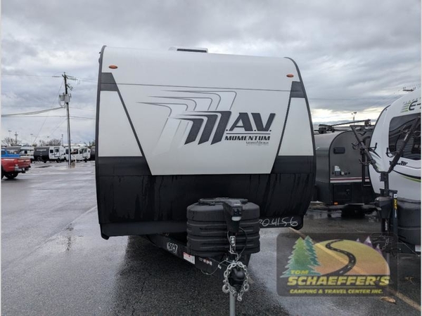 The Momentum MAV toy hauler travel trailers by Grand Design are designed to provide exactly what you need. The spacious garage provides tons of cargo space, with no wheel wells to get in the way. Additional storage includes magnetic storage door catches, and overhead consoles throughout. Conveniences like motion sensor lights and USB outlets will make your life easier, and you will be comfortable in all seasons with the 30K BTU furnace plus 15K BTU ducted air conditioning. The standard Solar Package comes with a 180W solar panel, a 40 Amp charge controller with Bluetooth, and a 12V refrigerator so you can go off-grid when the adventure calls for it.