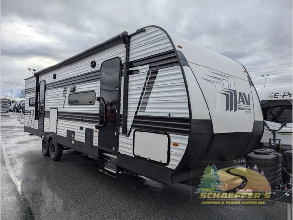 The spacious garage area is perfect for hauling your favorite toys, and the two entry/exit doors make it easy to get in and out. The front bedroom is a peaceful retreat, featuring a queen bed, wardrobes, and plenty of storage for your gear. Further in the heart of this unit, the U-shaped dinette is perfect for enjoying meals or game nights, and the pull-out trash makes cleanup a breeze. The kitchen is equipped with a microwave and 8 cu refrigerator, so you can fuel up for your next adventure. The theater seating is perfect for movie nights or catching up on your favorite shows, and the electric Happijac bunks provide a comfortable spot to rest. The full bathroom is a refreshing oasis, equipped with everything you need to start your day feeling revitalized.