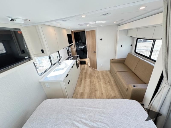 With any Thrive travel trailer by Winnebago, you can camp with functionality, comfort, and convenience! The large front viewing window will be the first thing that catches your eye, and the fiberglass sidewalls with Azdel Onboard provide a durable trailer made to last. There is also an exterior ladder, along with front radius profile lights, power stabilizer jacks, and a powered awning with LED lighting to name a few exterior features. You will stay powered up by the 30-amp power cord and 200-watt solar panel, plus there is a tankless water heater for endless hot showers. Inside, you'll love the custom Winnebago furniture, carpetless side outs, molded fiberglass countertops, and residential recessed ceiling lights to keep your space well lit!