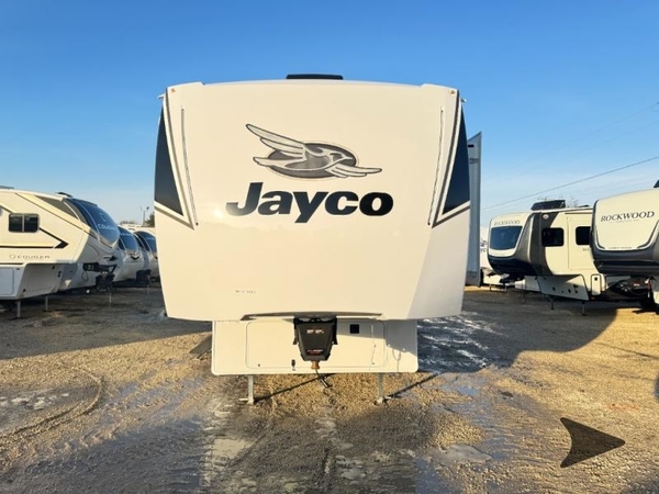 With any Eagle SLE fifth wheel by Jayco, you will enjoy a lighter tow weight, high-end finishes, and the same quality construction you've come to expect from Jayco! There is an Alpha Ply TPO roof membrane, a fully enclosed and heated underbelly, plus Stronghold VBL walls for added durability. There is also a rear 2" towing receiver outside, along with metal slam latch baggage doors, MORryde Step Above entry steps, and a Winegard Air 360 antenna with router prep if you want to stay connected as you camp. Once inside you'll enjoy the handcrafted door/drawer fronts, shower skylight, and residential vinyl flooring throughout with no carpet for an easier clean. The on-demand water heater, 30K BTU furnace, and 15K BTU "Whisper Quiet" A/C will ensure your comfort, and the Overland 1 Solar Package will provide off-grid capabilities!