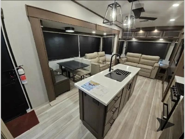 You will be so excited to take this Cougar fifth wheel out for the first time! Because of its secluded and fully stocked master suite at the front, this unit is perfect for a couple who wants to see the country or visit family. The master bathroom has a wonderful walk-in closet that has shoe storage, drawers, and preparations for a washer/dryer. There is also under-bed storage in the bedroom portion, and the queen bed slide gives you a little more space to get to the dresser and linen closet. The half bathroom is located out in the main living area so that your friends will have a place to go when they visit. Opposing slides keep this living area open for lounging comfortably on the tri-fold sleeper sofa and theater seating, and you can get everyone together for a board game at the booth dinette with storage drawers. There is also a pivoting entertainment door with a hidden pantry and cordless vacuum prep behind; how convenient!