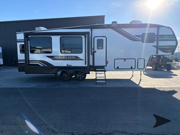 With any Reflection fifth wheel by Grand Design, you will have a solar panel for off-grid camping and a 60 amp charge controller and inverter prep, a Universal All-In-One docking station, unobstructed pass-through storage, and Goodyear Endurance tires. Each is constructed of gel coat exterior sidewalls, residential 5" truss rafters, walk-on roof decking, a fiberglass and radiant foil roof and front cap insulation plus laminated aluminum framed side walls, roof and end walls in slide rooms. Head inside to enjoy residential hardwood cabinet doors, premium Congoleum flooring, a spacious shower with a glass door, and many more comforts!