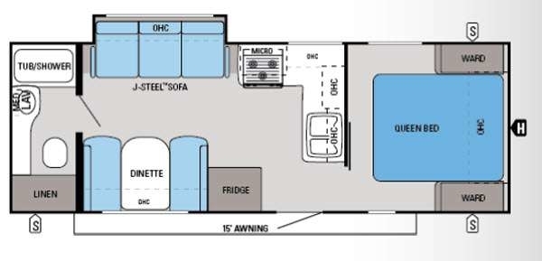 The White Hawk 24RBS travel trailer by Jayco offers a rear bath with a single slide.