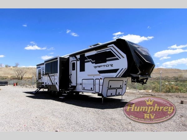 Experience a breath of fresh air with one of these Keystone RV Raptor fifth wheel toy haulers! Their rugged construction consists of a one-piece Alpha Super Flex TPO roof membrane, Dyna Span floor decking, and 5,000 lb. frame-welded tie- downs to keep your toys in place as you travel. Some unexpected conveniences you will appreciate include an Omni-Chill A/C system to keep you cool on those hot summer days, a Furrion backup camera, MaxTurn technology with a Helux pin box, and a Generation 3 iN-Command smart automation system with Global Connect to make life easier. There is also designer style vinyl flooring throughout, along with hardwood ceiling treatment with LED accent lighting, beach wood and white cabinetry, and many more interior comforts!