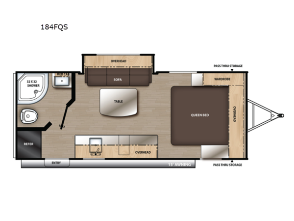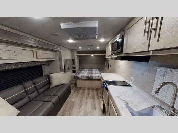 When you're ready to escape the hustle and bustle of the city life, head to the woods in this cozy travel trailer for two. The sofa slide out with a table will provide a place to relax, eat, and even sleep an overnight guest. Preparing at-home meals each day will be a breeze with a two burner cooktop and a microwave oven, plus there is ample counter space for your work in the kitchen. The spacious full bath on board means you won't have to use the camp's facilities, and the front queen bed will make this model feel just like home. After dinner is cleaned up, head outdoors to relax under the 15' electric awning with multicolored LED lights and a remote. Camping has never been easier!
