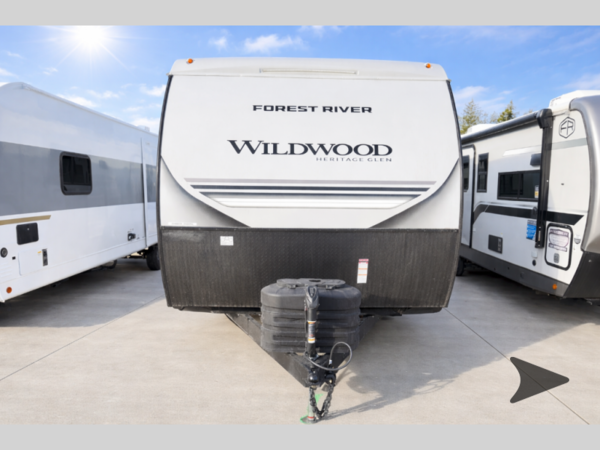 The Wildwood Heritage Glen Hyper-Lyte travel trailer by Forest River offers stability with a wide stance axle system, easy setup with a power tongue jack with an LED docking light, and safe entry with the Step Above aluminum entry steps. The interior includes Temple Cherry cabinetry with matte gold hardware, hidden hinges on the cabinet doors, and a residential single bowl undermount sink. You will also find a back-up camera prep and solar prep, an outdoor shower, and many more exterior conveniences.