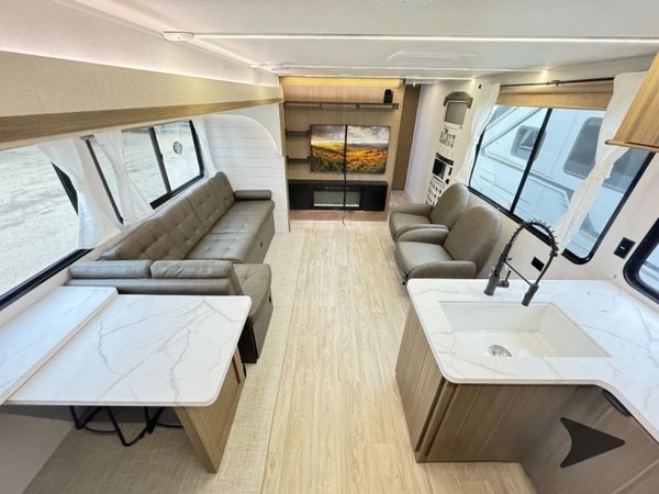 This Wildwood Platinum travel trailer is perfect for your family of five looking for a new adventure. You will enjoy the rear kitchen that includes a refrigerator and cooktop. The Versa-Lounge will provide comfortable seating and sleeping space, and the Versa Flex table gives you a space to dine and work if needed. This unit also includes two lounge chairs so you'll feel right at home! You'll love the full bath in this unit, and the custom king bed with Versa-Tilt in the private bedroom is perfect for a good night's rest.