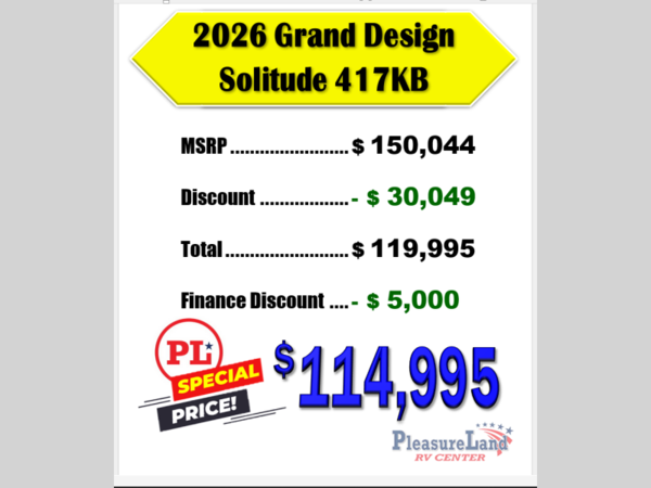 Each Solitude fifth wheel by Grand Design features a 101" wide-body construction, heavy duty 8,000 lb. axles, frameless tinted windows, and high-gloss gel coat sidewalls. You can camp year around thanks to the Weather-Tek Package that includes a 35K BTU high-capacity furnace, an all-in-one enclosed and heated utility center, and a fully enclosed underbelly with heated tanks and storage. Inside, you'll love the premium roller shades, hardwood cabinet doors, solid surface countertops, plus residential finishes throughout to make you truly feel at home. Each model also includes a MORryde CRE3000 suspension system, self adjusting brakes, and a MORryde pin box that will provide smooth towing from home to campground. Affordable luxury is possible with the Solitude fifth wheels; choose yours today!