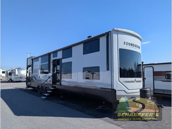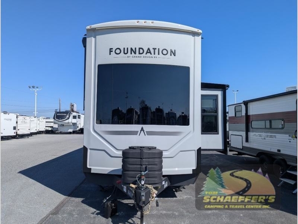 With any Foundation destination trailer by Grand Design, you can choose to stay longer surrounded by residential inspired features! The durable construction includes aluminum framing with a temperature-controlled fiberglass laminated wall, composite exterior decking with waterproof woven vinyl flooring, quad seal protection, and an industry-leading maintenance-less one-piece roof with composite roof decking panels. There is also an exterior convenience center, brass plumbing fittings, an 8' 5" wide body frame, and sleek bonded square glass windows. The interior is packed with residential features, including GE appliances, motorized shades in the living room and kitchen, solid surface countertops in the kitchen and bath, and the list goes on!