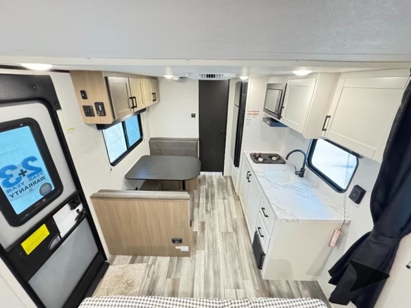This travel trailer includes everything you need for fun trips at the lake. When you arrive at the campground, you can unload the exterior storage, then put out the 12' power awning with LED lights. There is also an LP Quick Connect if you want to hook up your own grill! The booth dinette inside will provide a place to dine together, and the full rear bath with a tub/shower will make bath time easier than ever for little ones. A front RV queen bed will provide a great night's rest, and the privacy curtain will be appreciated when you're getting dressed in the morning.