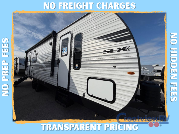 The Jayco Jay Flight SLX travel trailer is quite easy to own because it is lightweight for an easier towing experience. Built on a fully integrated A-frame with galvanized-steel, impact-resistant wheel wells, the Jay Flight SLX has quality at its very foundation. That quality continues on to the electric self-adjusting brakes, easy-lube hubs, Magnum Truss roof system, and LP quick connect. Some of what the mandatory Customer Value Package includes is backup camera prep, Keyed-Alike entry and baggage doors, and an on-demand tankless water heater.
