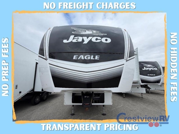 With any Eagle fifth wheel by Jayco you will appreciate durable construction materials, like the Magnum Truss Roof and the Stronghold VBL laminated walls. The JAYCOMMAND Smart RV system puts you in control of your RV's functions, and the 5 Star Handling Package will provide smooth towing from home to camp. Each model features Climate Shield zero-degree tested weather protection and the industry-exclusive HELIX cooling system that features two 15,000 BTU Whisper Quiet A/C's to keep you comfortable year around. Some of the exterior conveniences you are sure to love are the pass-through storage with Slam-Latch baggage doors and an automotive style front cap with max turn radius. The Eagle fifth wheels are designed to make you feel at home with solid hardwood slide fascia, residential vinyl flooring throughout, 100% no floor vents, and blackout roller shades with reflective side throughout for added privacy and insulation.