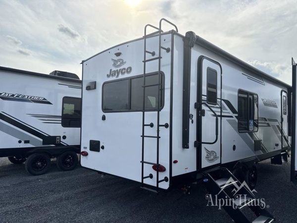 With any Jay Feather travel trailer by Jayco, you will enjoy lightweight towing, convenient exterior amenities, and at-home comforts inside! The Overlander 1 Solar Package included within the Jay Sport Package comes with a 200W solar panel and a 30-amp digital controller so you can enjoy some off-grid camping. There is also a modern graphics package, Solid fold-down step with aluminum tread steps on the main entry doorstep, and Climate Shield 0 -100° F tested weather insulation package that will allow you to camp in various types of climates. The Customer Value Package will make time outdoors easier than ever with a power tongue jack and Automotive-style aluminum rims, plus radial tires with self-adjusting electric brakes. More exterior features include a Keyed-Alike doors, a Magnum Truss roof system, and the list goes on! And we haven't even touched on the interior comforts, like the seamless countertops and Residential vinyl flooring throughout, decorative kitchen backsplash, handcrafted hardwood door/drawer fronts, and multiple USB charging ports to keep you going!