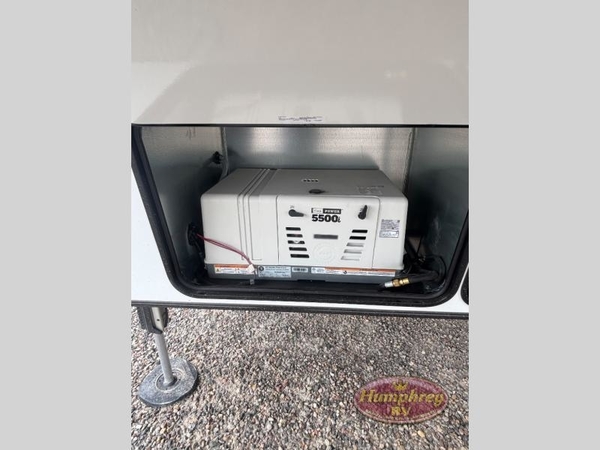 Grab your helmets and load up the dirt bikes in this spacious fifth wheel! Once you've arrived at the campground, you can use the ramp door to unload your toys from the 17' 6" garage area. There are dual opposing sofas here, along with an electric bed for guests to sleep on. The queen bed in the front bedroom offers a good night's rest and all of your clothes can be kept tidy in the wardrobe slide, plus there are dual wardrobes and nightstands on either side of the bed. Head to the kitchen where you'll find generous counter space, a flip-up countertop, a three burner range and a residential microwave, plus a 16.5 cu. ft. 12V refrigerator slide for food storage.
