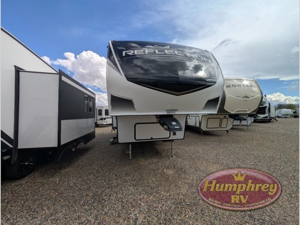 With any Reflection 150 Series fifth wheel by Grand Design, there is more available payload capacity and a broader range of half-ton trucks capable of towing this fifth wheel, and no slider hitch is needed thanks to the 90-degree turning radius which makes them short bed friendly and easier to tow. The mandatory Ultimate Power package provides a "One-Touch" automatic leveling system and a detachable power cord with LED light for easy setup, plus motion sensor pass-through lighting and entry lighting, and the Tire Linc TPMS will help you stay safe on the road. The interior offers residential luxury from the cabinetry and gunstock hardware plus the booth dinette to the residential-style window treatment. Make your refined decision today!