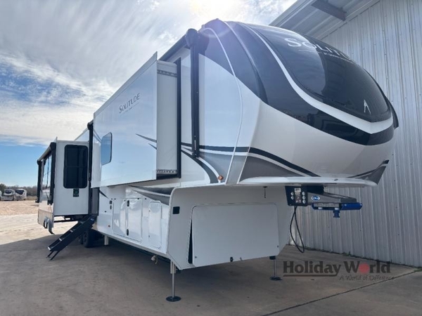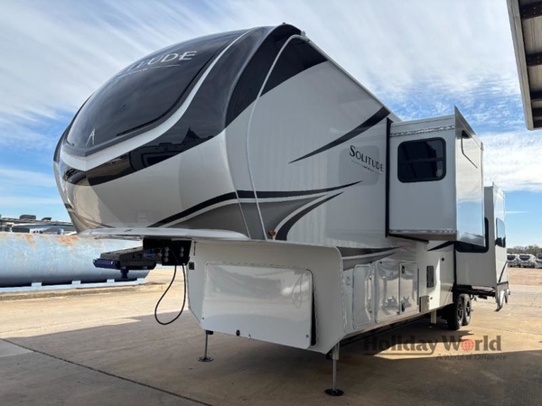 Each Solitude fifth wheel by Grand Design features a 101" wide-body construction, heavy duty 8,000 lb. axles, frameless tinted windows, and high-gloss gel coat sidewalls. You can camp year around thanks to the Weather-Tek Package that includes a 35K BTU high-capacity furnace, an all-in-one enclosed and heated utility center, and a fully enclosed underbelly with heated tanks and storage. Inside, you'll love the premium roller shades, hardwood cabinet doors, solid surface countertops, plus residential finishes throughout to make you truly feel at home. Each model also includes a MORryde CRE3000 suspension system, self adjusting brakes, and a MORryde pin box that will provide smooth towing from home to campground. Affordable luxury is possible with the Solitude fifth wheels; choose yours today!
