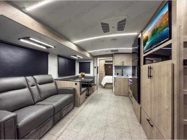 Experience the ultimate in comfort and convenience with this luxurious travel trailer. When you enter this trailer, you'll find convenient shoe storage to your right below the wardrobe/pantry. The full rear bathroom has a 30" x 36" shower with skylight for you to rinse off after you come in from an afternoon hike, and you can lounge on the tri-fold sofa or U-shaped dinette with removable ottoman after you are clean. The large slide creates more interior space, so you can cook freely on the three-burner range with oven in the kitchen, also, you can cook on the outside griddle. You'll have a private bedroom that you can retreat to at the end of a long day, and the 60" x 80" queen bed will provide comfort while you sleep.