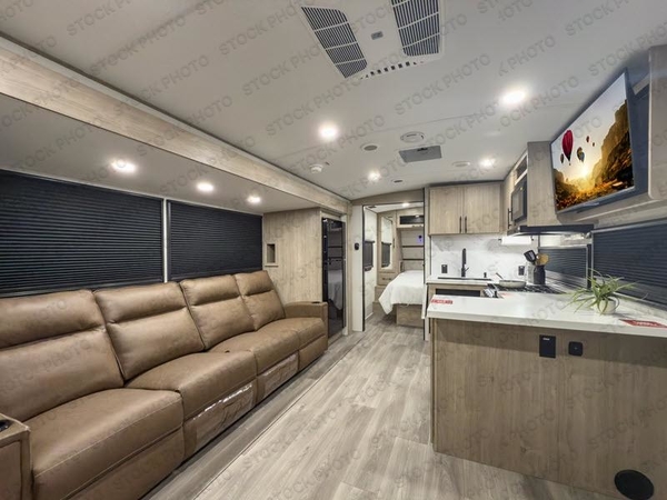 At the front of this 2810BH travel trailer, youll find a spacious full bedroom featuring a 60" x 80" queen bed, perfect for resting in comfort after a long day, along with dual wardrobes on each side to store your clothes and essentials. For added convenience, one of the two entry doors is located directly in the bedroom. Moving toward the center, the living area and kitchen create a welcoming space to relax and dine. The slide-out houses a quad theater seat, offering plenty of room to lounge, as well as a 10-cu. ft. refrigerator to keep your groceries fresh. Across from it, the U-shaped kitchen comes fully equipped with everything you need to cook comfortably, including a stainless-steel sink, three-burner range with oven, microwave, and solid surface countertops for meal prep. A bar top with stools provides a cozy dining spot, while a pull-out pantry keeps snacks organized. At the rear, the corner bathroom includes a 30" x 36" residential walk-in shower with skylight and a mirrored medicine cabinet, so you can skip the campsite facilities. Adjacent to it, the bunkhouse accommodates guests with a 36" flip-top bunk, tri-fold sofa, and even a flip-up desk, perfect for studying or remote work while on the road.