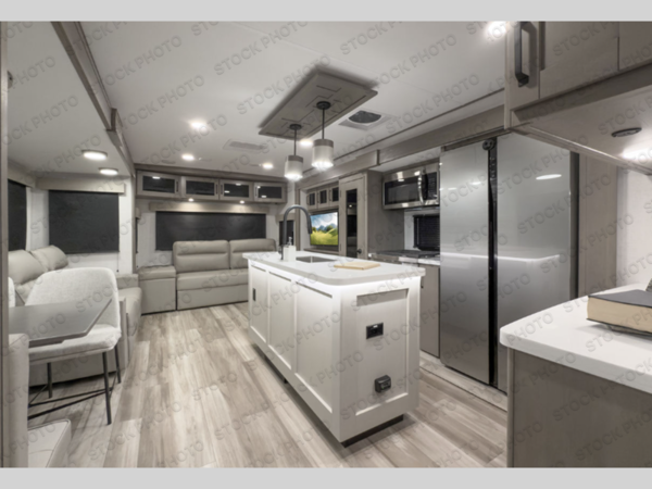 This rear living travel trailer will be perfect for extended stays at the campground or quick weekend trips to the lake! Once you've unloaded your gear from the pass-thru storage, head inside to relax on the rear tri-fold sofa with an adjustable headrest or on the theater seating across from the 40" TV and fireplace. There is also a booth dinette where you can dine together, or you can choose the optional swivel dinette. The spacious kitchen island will make meal time easier than ever, plus there is a pantry and 16 cu. ft. 12V refrigerator for food storage. The full bath is right next to the front private bedroom for easy nighttime use, and speaking of nighttime, you're sure to sleep soundly on the queen bed slide. There is also a large front closet, TV prep, plus washer and dryer prep if you choose to add these appliances.