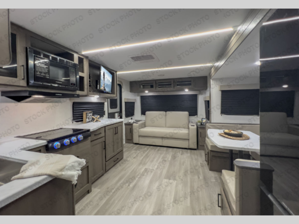 the amount of interior space you have in the living area thanks to the U-shaped dinette slide, which can be switched out for optional theater seats. The rear 70" sleeper sofa will be perfect for guests to sleep on, and the 32" TV lets you enjoy movie nights. There is a three burner range and convection microwave/combo air fryer to cook meals inside, or you can cook on the exterior griddle with a 1.7 cu. ft. refrigerator. And the 17' power awning will provide much wanted shade as you visit with friends. Back inside, the walk-thru bath is both spacious and convenient since it can be accessed from the main living area and the front master bedroom. Here, you'll find a queen bed, storage space, plus TV prep if you want to add a television. You even have your own exterior entry door for convenience!