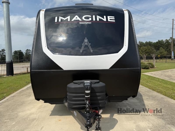 Just imagine leaving the world behind and secluding yourself away with your favorite people in your Grand Design Imagine travel trailer! The Imagine has been designed to enjoy camping and includes a high-capacity furnace, a heated and enclosed underbelly with suspended tanks, a designated heat duct to the subfloor, and a high-density roof insulation with attic vent. You'll have a large panoramic window to let natural lighting in and an adjustable Power Awning with LED Lights for those night gatherings. The exclusive drop-frame pass-through storage compartment is going to allow you to bring along lots of equipment, and the universal docking station is an all-in-one location for utilities and hook-ups. You'll also have oversized tank capacities so that you can fill and empty your tanks less often.