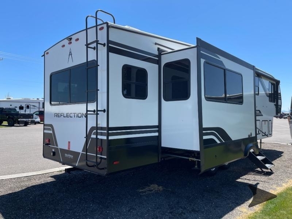 With any Reflection fifth wheel by Grand Design, you will have a solar panel for off-grid camping and a 60 amp charge controller and inverter prep, a Universal All-In-One docking station, unobstructed pass-through storage, and Goodyear Endurance tires. Each is constructed of gel coat exterior sidewalls, residential 5" truss rafters, walk-on roof decking, a fiberglass and radiant foil roof and front cap insulation plus laminated aluminum framed side walls, roof and end walls in slide rooms. Head inside to enjoy residential hardwood cabinet doors, premium Congoleum flooring, a spacious shower with a glass door, and many more comforts!