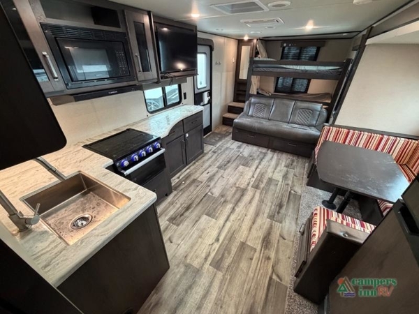 Are you ready to camp in comfort with your family or friends? This travel trailer allows you to do just that! There are double-size bunks in the back with step storage for books or board games. There is also a closet here to keep clothes wrinkle-free. The U-shaped dinette within the slide out can be switched out for the optional theatre seats, and the jackknife sofa will be the perfect spot to visit with your crew. This model features a walk-through bath that leads to the front master bedroom. You'll love the queen bed here, overhead storage, and your own exterior entry door for convenience.