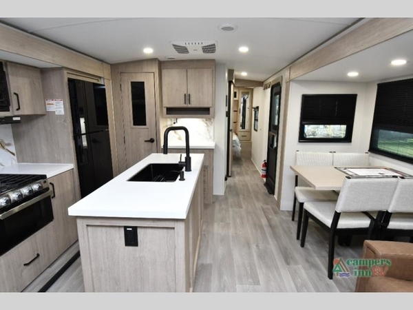 The kitchen is designed for real meals on the road, featuring a center island with stainless steel sink, generous counter space, and smart storage throughout. Built for extended-season camping, this Imagine 2970RL is equipped with the Four Seasons Protection Package, heated and enclosed underbelly with suspended tanks, and a high-capacity furnace. Power comes easy with the Ultimate Power Package, Solar Package, 50 amp service wired and framed for a second A/C, and a factory-installed second ducted A/C. Outside, dual power awnings with LED lighting, Goodyear tires, ABS axle assembly with sway control, and Peace of Mind Package deliver comfort and confidence wherever you set up camp.