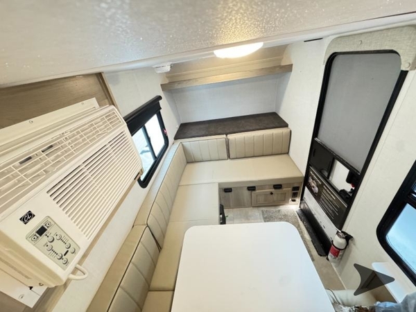 When you step into this compact travel trailer, youre welcomed by a spacious 54" x 91" U-dinette that provides the perfect spot for family meals or board games after a day of outdoor adventure. At the front, a cozy 63" x 24" bunk and an overhead shelf offer a comfortable place to rest, while an additional 63" x 24" top bunk at the rear adds even more sleeping space for guests or kids. To keep you cool during hot summer trips, the trailer includes a built-in A/C unit. As the sun begins to set, you can relax under the 9' awning and enjoy the evening breeze, and the rear outdoor kitchen, complete with a refrigerator and sink, makes it easy to whip up simple meals without ever stepping inside.