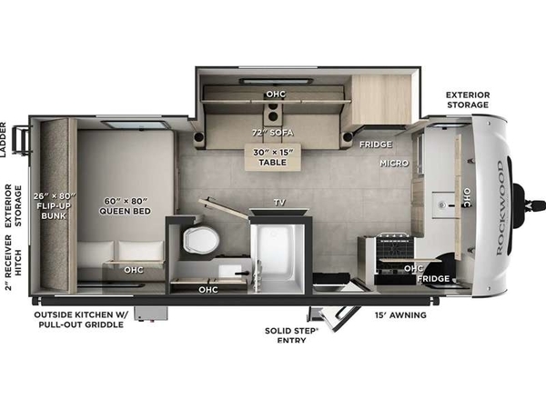 The G20FK stands out with its front kitchen layout, offering extended countertop space, a stainless steel sink, cooktop, microwave, and refrigerator, making it perfect for campers who love to cook.
