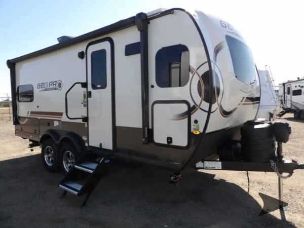 A walk-through bathroom sits in the middle of the coach, separating the kitchen from the rear living area. In the back, a sofa converts into a Murphy bed, giving you both daytime seating and a comfortable sleeping space at night. This model blends culinary convenience with flexible living and sleeping arrangements, making it one of the most unique layouts in the Geo Pro lineup.