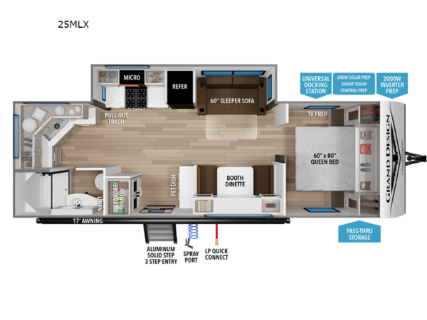 Outside, a large power awning with LED lighting creates the perfect shaded outdoor living area, while pass-through storage provides room for camping gear and outdoor equipment.