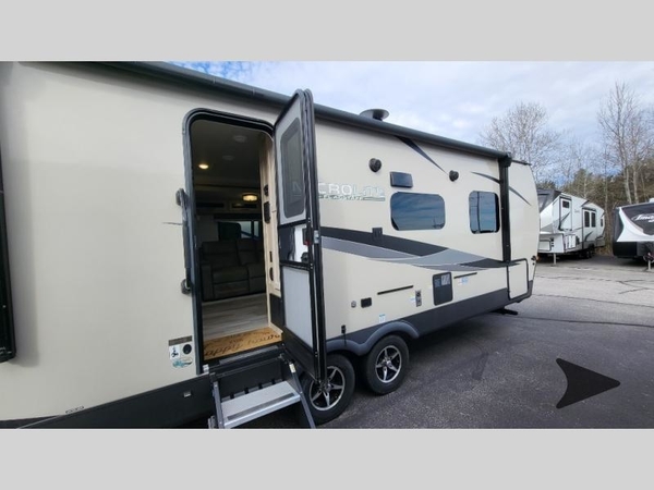 Each Flagstaff Micro Lite travel trailer by Forest River features laminated fiberglass sidewalls, sleek tinted frameless windows, and Azdel composite panels for added strength and support. You can easily tow these travel trailers with an SUV since they are so lightweight, and there is a power tongue jack for quick and easy set up. Some of the convenient amenities you will enjoy are the Teton All-In-One WiFi booster/LTE prep and antenna, the double battery boxes, Key-Alike locks, plus a Maxxair fan with a cover to keep the fresh air moving in your RV. You will love the modern look of the Newport Ash or Autumn Wood cabinetry, plus there are solid wood cabinet doors, solid surface kitchen countertops, and a Showermiser water saving system in the bathroom. Choose a Flagstaff Micro Lite travel trailer and you won't be disappointed!
