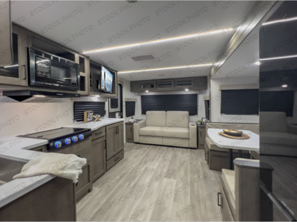 the amount of interior space you have in the living area thanks to the U-shaped dinette slide, which can be switched out for optional theater seats. The rear 70" sleeper sofa will be perfect for guests to sleep on, and the 32" TV lets you enjoy movie nights. There is a three burner range and convection microwave/combo air fryer to cook meals inside, or you can cook on the exterior griddle with a 1.7 cu. ft. refrigerator. And the 17' power awning will provide much wanted shade as you visit with friends. Back inside, the walk-thru bath is both spacious and convenient since it can be accessed from the main living area and the front master bedroom. Here, you'll find a queen bed, storage space, plus TV prep if you want to add a television. You even have your own exterior entry door for convenience!