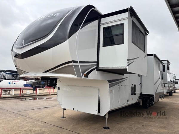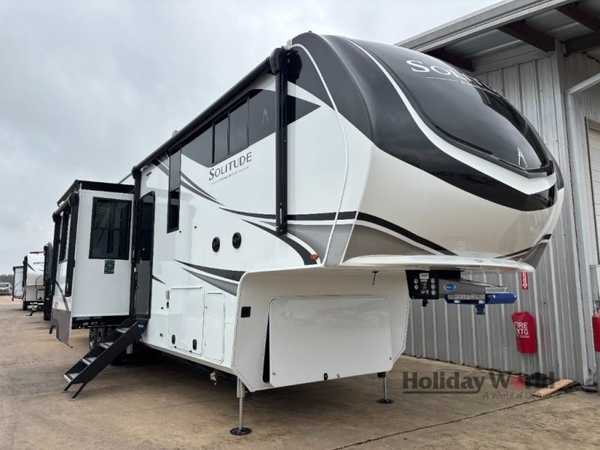 Each Solitude fifth wheel by Grand Design features a 101" wide-body construction, heavy duty 8,000 lb. axles, frameless tinted windows, and high-gloss gel coat sidewalls. You can camp during harsh weather thanks to the Weather-Tek Package that includes a 35K BTU high-capacity furnace, an all-in-one enclosed and heated utility center, and a fully enclosed underbelly with heated tanks and storage. Inside, you'll love the premium roller shades, hardwood cabinet doors, solid surface countertops, plus residential finishes throughout to make you truly feel at home. Each model also includes a MORryde CRE3000 suspension system, and a MORryde pin box that will provide smooth towing from home to campground. Affordable luxury is possible with the Solitude fifth wheels; choose yours today!