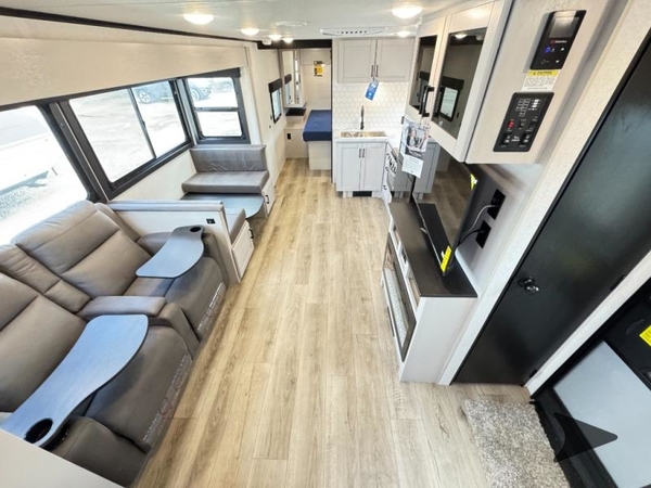 This travel trailer with a full rear bath is sure to bring you comfort wherever you camp. The front private bedroom with queen bed and dual wardrobes will have you feeling right at home. You can enjoy home cooked meals while at the campsite thanks to the three-burner cooktop and 11 cu. ft. 12V refrigerator, plus there is a walk-in pantry to store all of your favorite snacks along with a stainless-steel sink. The tri-fold sofa and booth dinette within the slide out offer comfortable places to relax and dine, both of them acting as extra sleeping space if needed. You can even cook breakfast outdoors using the outside kitchen and stay protected from the elements by the 19' power awning!