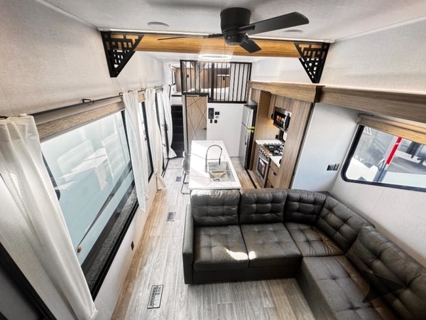 Stretch out, spread out, and basically move in. This destination trailer gives you a front and rear bedroom, each with a king-size bed so everyone gets a true residential sleep space, not just the primary occupants. Each bedroom is near its own full bathroom, making it perfect for couples traveling together, extended family, or long-term guests. In the middle, the living area centers around a spacious L-shaped sofa thats ideal for lounging, movie nights, or extra sleeping space when needed. The kitchen feels like home too, thanks to a generous kitchen island that adds prep space and storage, plus stainless steel appliances that look sharp and make everyday cooking feel easy and residential.