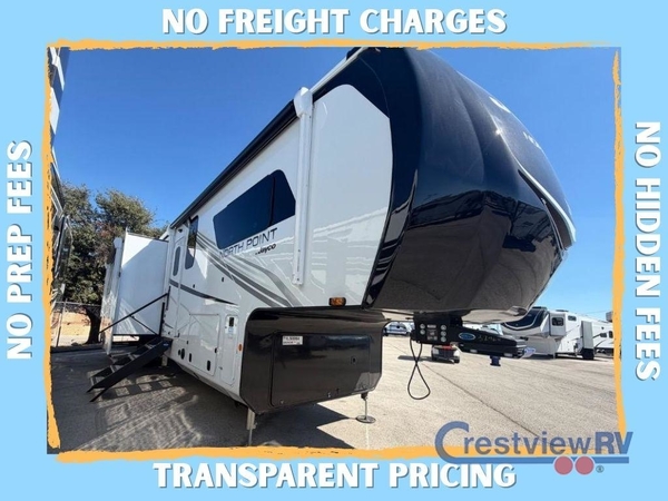 With any North Point fifth wheel by Jayco you begin with a strong foundation with a custom frame, designed and sized specifically to best support each unit. Constructed with Stronghold VBL aluminum framed, vacuum bond laminated walls and the Magnum Truss XL6 roof system with an Alpha roof membrane system, which is the strongest tested roof in the industry. The 5-Star Handling package is included with H-rated tires with TPMS, a MORryde rubber pin box, Dexter axles with Nev-R-Adjust brakes, MORryde CRE-3000 rubberized suspension and wet bolt fasteners and bronze bushings. The interior has handcrafted hardwood glazed doors and drawers, vinyl flooring throughout, an integrated under-mount sink in the main bathroom, plus so much more you just have to see one to believe it all!