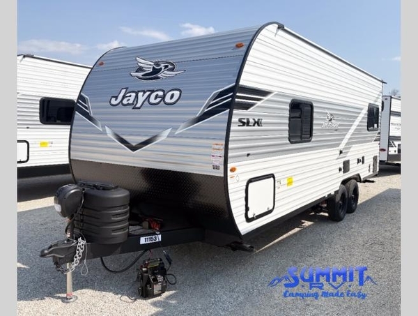 The Jayco Jay Flight SLX travel trailer is quite easy to own because it is lightweight for an easier towing experience. Built on a fully integrated A-frame with galvanized-steel, impact-resistant wheel wells, the Jay Flight SLX has quality at its very foundation. That quality continues on to the electric self-adjusting brakes, easy-lube hubs, Magnum Truss roof system, and LP quick connect. Some of what the mandatory Customer Value Package includes is backup camera prep, Keyed-Alike entry and baggage doors, and an on-demand tankless water heater.
