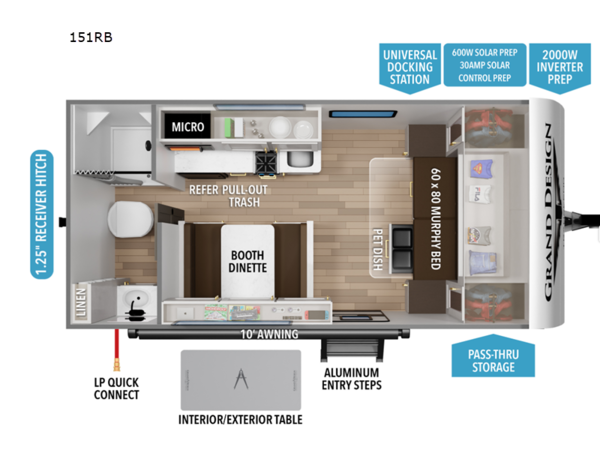 This is the perfect couple's trailer with versatile seating and sleeping space! You'll find a queen-size Murphy bed up front with storage space beside and above plus a full rear bath for added privacy. Once you've made lunch in the full kitchen, you can dine at the booth dinette or take your plate outdoors to sit under the 10' power awning. You'll also find pass-thru storage outside that will be perfect for fishing poles, lawn chairs, tools and more!