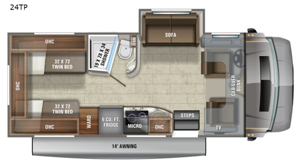 The hardest decision you will have to make with this motorhome is where to take it! There is plenty of sitting and sleeping space for everyone between the rear 32" x 72" twin beds, the overhead bunk with a 750 lb. capacity, the sofa, and the Ultraleather® swivel driver and passenger seats. The full bathroom has a decorative surround 19" x 28" x 34" shower with a skylight and a stainless steel sink to freshen up after a long day on the road. There is an abundance of storage between the overhead cabinets and the wardrobe next to one of the twin beds, plus a 6 cu. ft. refrigerator to keep your perishables cold and fresh. If you don't need the extra sleeping space then you can add the B-Plus option where the cabover bunk is switched out for an entertainment center!