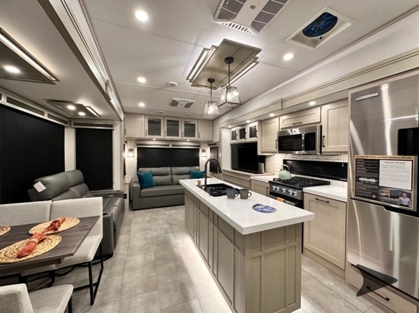 Traveling for long periods at a time is made easy with this gourmet kitchen that can feed your entire group a holiday meal! The professional-grade stainless steel cooktop with a built-in oven, microwave, 12V 20 cu. ft. refrigerator, and a kitchen island offers everything you will need to enjoy cooking for your family and guests. There is abundant storage throughout multiple overhead cabinets, a kitchen pantry and hutch, a bath linen cabinet for your towels, and in the front master bedroom which features a large closet. In the bedroom there is also a queen bed slide for added space to sleep comfortable at night, or you may choose an optional king bed if you enjoy more space. You will also find a closet with washer/dryer prep, large wardrobe, plus a slide top dresser. Two nice awnings will provide outdoor living space keeping you protected from the sun and rain, and you can add an optional pull-out kitchen to enjoy convenient cooking outdoors as well.
