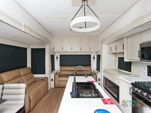 Whether youre planning long road trips or full-time RV living, the Grand Design Solitude 310GK fifth wheel delivers residential comfort in every detail. The chef-inspired gourmet kitchen is built to impress, featuring a professional-grade stainless steel cooktop with built-in oven, microwave, and a 12V 20 cu. ft. refrigeratorperfect for preparing everything from quick breakfasts to full holiday meals. A large center island adds prep space and functionality, while abundant overhead cabinetry, an oversized pantry, and a stylish hutch keep everything organized and within reach.