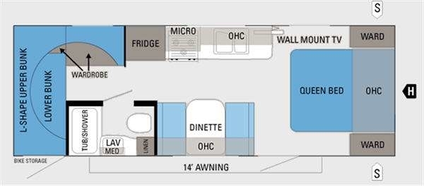 Jay Feather Select Travel Trailer by Jayco, Rear L-Shape Upper Bunk, Lower Bunk, Ward., Ext. Bike Storage, Tub/Shower, Toilet, Lav. w/Med. Cab., Linen, Booth Dinette, Refrigerator, Mirco., Dbl. Kitchen Sink, Front Queen Bed w/Dbl. Ward., Wall Mount TV, Overhead Cabinets Throughout, 14' Awning and More.