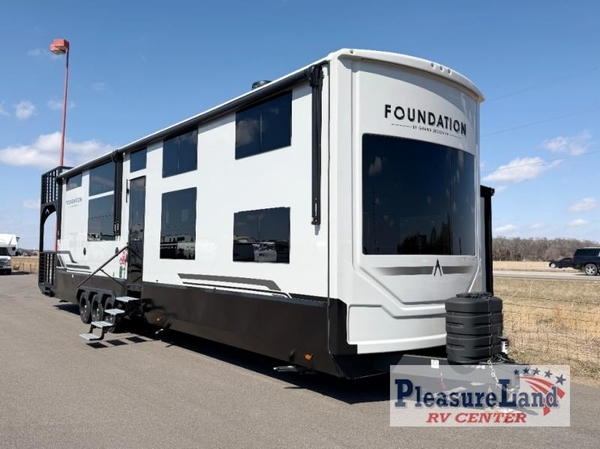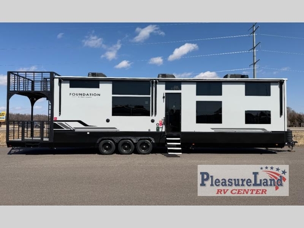 With any Foundation destination trailer by Grand Design, you can choose to stay longer surrounded by residential inspired features! The durable construction includes aluminum framing with a temperature-controlled fiberglass laminated wall, composite exterior decking with waterproof woven vinyl flooring, quad seal protection, and an industry-leading maintenance-less one-piece roof with composite roof decking panels. There is also an exterior convenience center, brass plumbing fittings, an 8' 5" wide body frame, and sleek bonded square glass windows. The interior is packed with residential features, including GE appliances, motorized shades in the living room and kitchen, solid surface countertops in the kitchen and bath, and the list goes on!