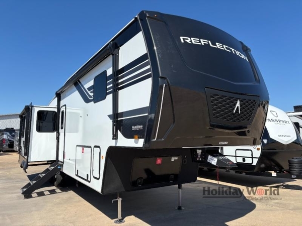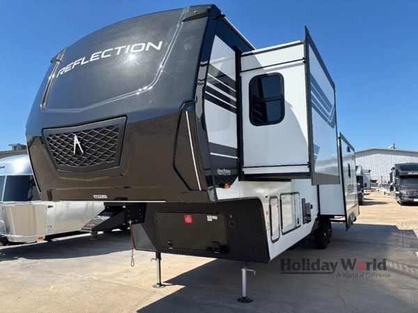 With any Reflection fifth wheel by Grand Design, you will have a solar panel for off-grid camping and a 60-amp charge controller and inverter prep, a Universal All-In-One docking station, unobstructed pass-through storage, and Goodyear Endurance tires. Each is constructed of gel coat exterior sidewalls, residential 5" truss rafters, walk-on roof decking, a fiberglass and radiant foil roof and front cap insulation plus laminated aluminum framed side walls, roof and end walls in slide rooms. Head inside to enjoy residential hardwood cabinet doors, premium Congoleum flooring, a spacious shower with a glass door, and many more comforts!