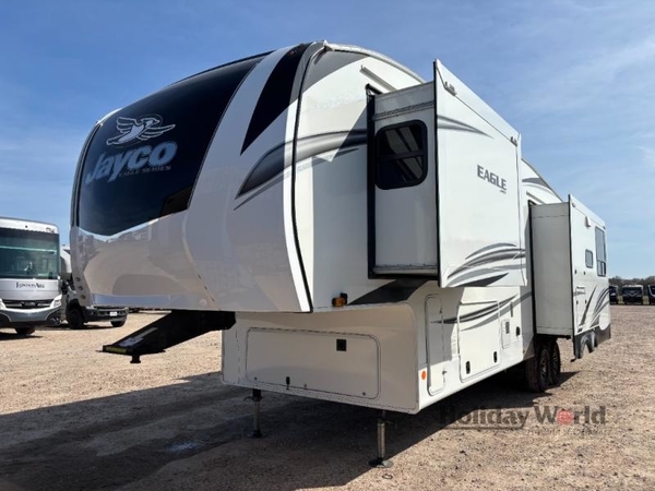 With any Eagle fifth wheel or travel trailer by Jayco you will appreciate durable construction materials, like the Magnum Tuff Roof and the Stonghold VBL laminated walls. The JAYCOMMAND Smart RV system puts you in control of your RV's function, and the 4 Star Handling Package will provide smooth towing from home to camp. Each model features Climate Shield zero-degree tested weather protection and the industry-exclusive HELIX cooling system that features two 15,000 BTU Whisper Quiet A/C's to keep you comfortable year around. Some of the exterior conveniences you are sure to love are the fully enclosed, LED-lit universal docking station, the pass-through storage with Slam-Latch baggage doors, and the painted fiberglass front cap with built-in specialty LED lighting. The Eagle fifth wheels and travel trailers are designed to make you feel at home with solid hardwood slide fascia, residential vinyl flooring, bathroom tile backsplash, and plenty of storage for all your belongings.