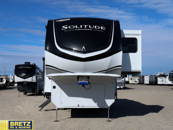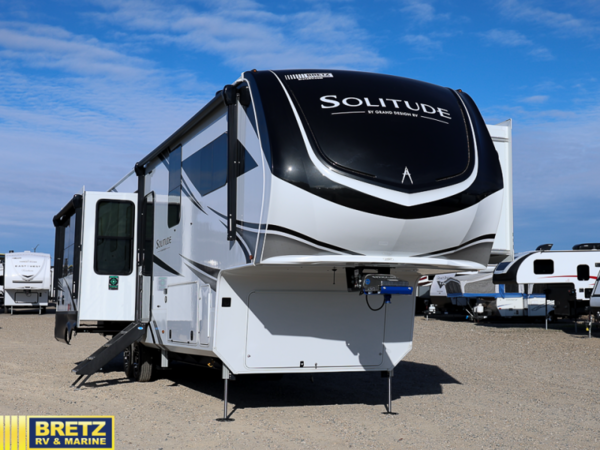 Each Solitude fifth wheel by Grand Design features a 101" wide-body construction, heavy duty 8,000 lb. axles, frameless tinted windows, and high-gloss gel coat sidewalls. You can camp during harsh weather thanks to the Weather-Tek Package that includes a 35K BTU high-capacity furnace, an all-in-one enclosed and heated utility center, and a fully enclosed underbelly with heated tanks and storage. Inside, you'll love the premium roller shades, hardwood cabinet doors, solid surface countertops, plus residential finishes throughout to make you truly feel at home. Each model also includes a MORryde CRE3000 suspension system, and a MORryde pin box that will provide smooth towing from home to campground. Affordable luxury is possible with the Solitude fifth wheels; choose yours today!