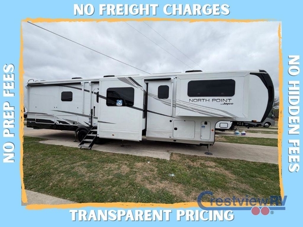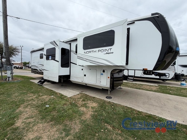 With any North Point fifth wheel by Jayco you begin with a strong foundation with a custom frame, designed and sized specifically to best support each unit. Constructed with Stronghold VBL aluminum framed, vacuum bond laminated walls and the Magnum Truss XL6 roof system with an Alpha roof membrane system, which is the strongest tested roof in the industry. The 5-Star Handling package is included with H-rated tires with TPMS, a MORryde rubber pin box, Dexter axles with Nev-R-Adjust brakes, MORryde CRE-3000 rubberized suspension and wet bolt fasteners and bronze bushings. The interior has handcrafted hardwood glazed doors and drawers, vinyl flooring throughout, an integrated under-mount sink in the main bathroom, plus so much more you just have to see one to believe it all!